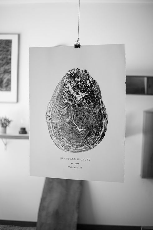 By applying oil-based ink to the cross section of a tree, we are able to bring a tree's story back to life. The print above was taken from a 78 year old shagbark hickory in Waverly, AL.